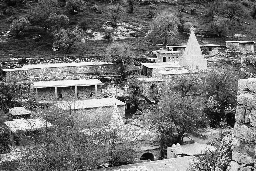 Una foto de Lalish con un filtro de blanco y negro para hacer creer que es muy antigua.