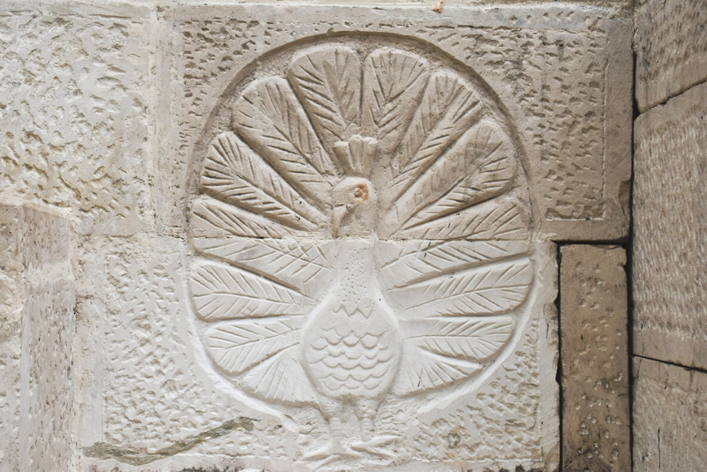 Si nos fijamos bien, veremos un pavo real tallado en varias baldosas y no es otra que la imagen de Melek taus. Ellos lo consideran un ángel, pero el animal no es más que una forma de representarlo.